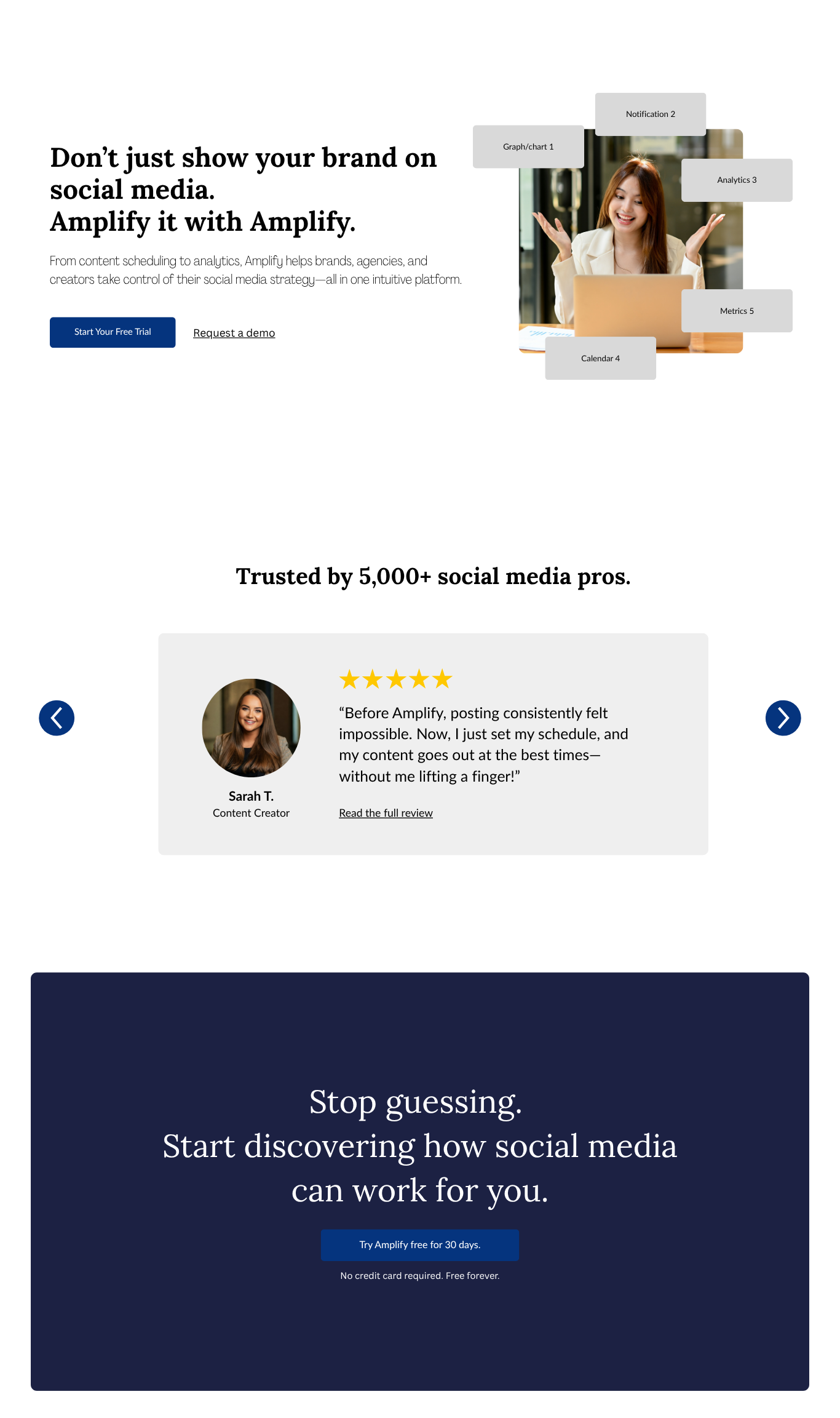 I will always advocate for images on landing pages, as they bring the copy to life and help users easily visualize using the platform. You could include images of your tool’s dashboard right away (in the hero section) or save it for later on in the page for a more “big reveal” approach.